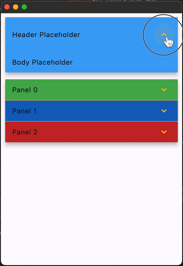 controls- A list of panels to display.divider_color- The color of the divider whenExpansionPanel.expandedisFalse.elevation- Defines the elevation of thecontrols, when expanded.expand_icon_color- The color of the icon.expanded_header_padding- Defines the padding around the header when expanded.spacing- The size of the gap between thecontrolss when expanded.
